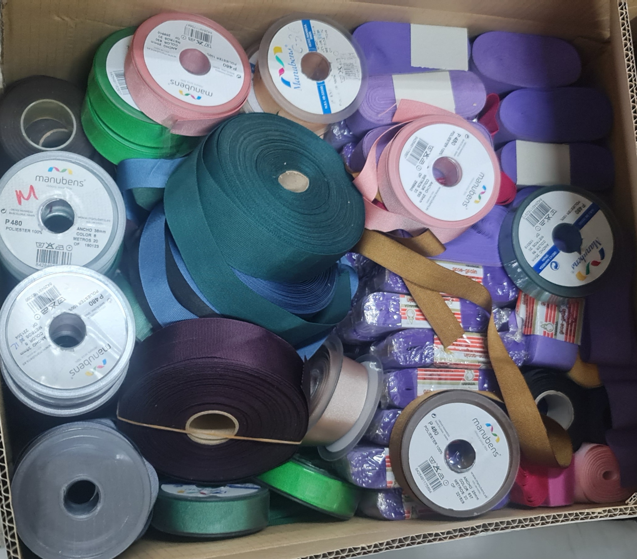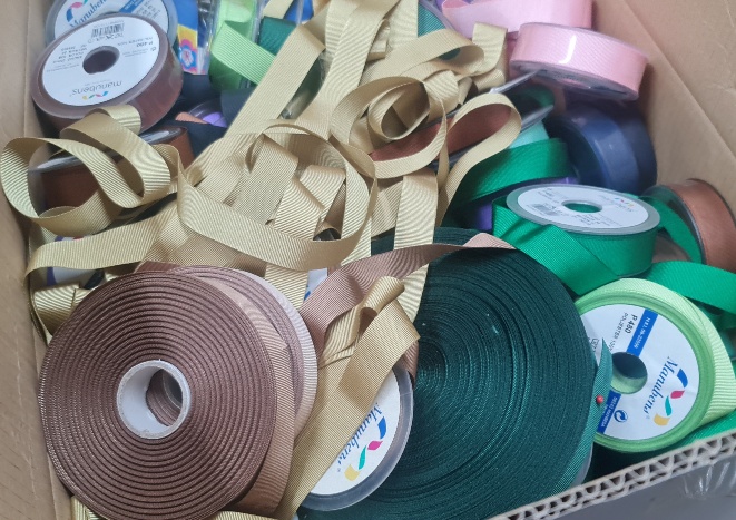 BOXES OF ROLL AND FINISHED CORDS. CURSORS, NEEDLES, GROSGRAIN AND SATIN RIBBONS, ETC.