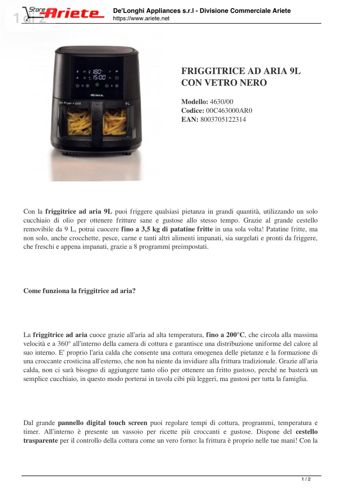 Friggitrice ad aria 9L | 4630 Ariete Nero | Ariete Store